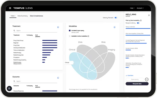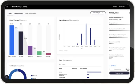 A. 「Tempus Lens」では、Tempusの医療データベースに対し、がん種や分子的特性、治療方法、治療効果などの条件でフィルターをかけ、対象となるデータを絞り込むことができます。お客さまのご関心に応じて、さまざまな条件でデータを探索いただくことが可能です。