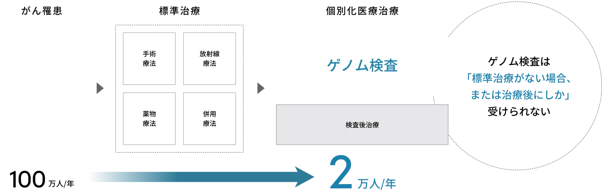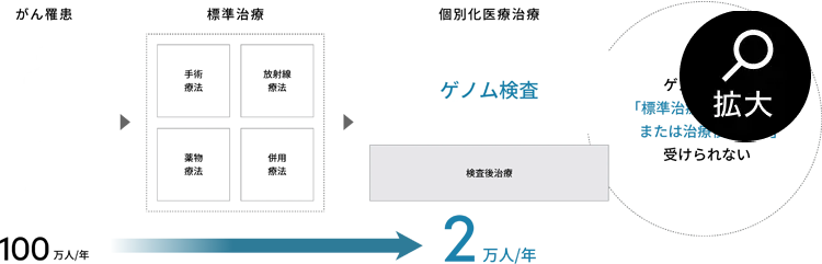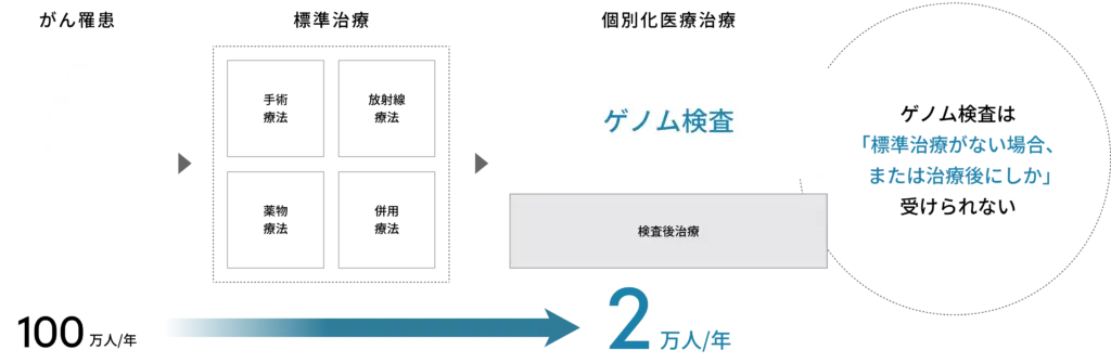 国内ではがん遺伝子パネル検査の実施が限られており、年間の新規がん患者さん100万人に対し、がん遺伝子パネル検査の実施数はわずか2万人にとどまっています。 がん遺伝子パネル検査を実施することにより適切な治療が見つかった場合は、より治療効果が高く副作用が少ない治療を受けることで、予後が改善することが期待されますが、日本の医療制度上、実施タイミングや実施回数などにさまざまな制約があります。その結果、国内におけるがん遺伝子パネル検査の実施率は、海外と比較して非常に低い水準にとどまっています。